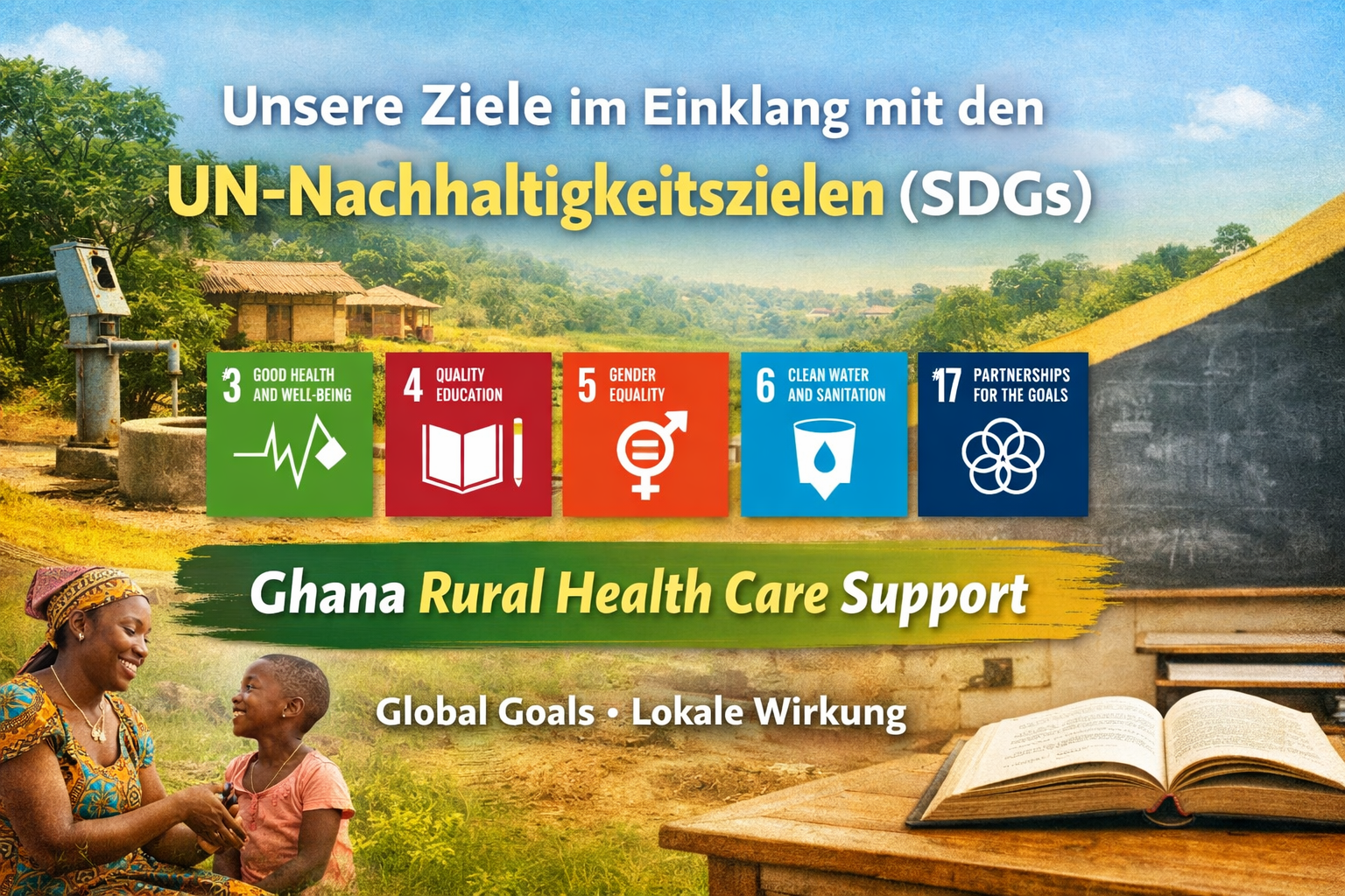 Die Arbeit unseres Vereins Ghana Rural Health Care Support (GRHCS) orientiert sich an den globalen Nachhaltigen Entwicklungszielen der Vereinten Nationen. Unser Fokus liegt dabei auf konkreten, wirksamen Maßnahmen, die das Leben von Menschen in ländlichen Regionen Ghanas langfristig verbessern.